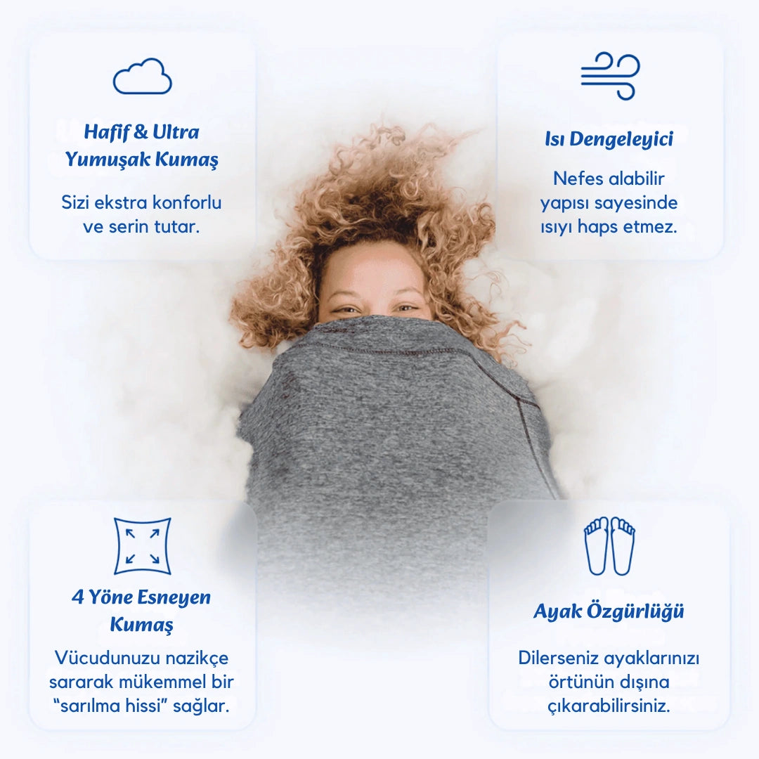 Olmaz. Isı dengeleyici kumaş teknolojisi, dört mevsim konfor sunar. Yazın serin ve ferah, kışın sıcak ve yumuşacık bir uyku ortamı sağlar. Açık ayak tasarımıyla vücut sıcaklığını kolayca dengeleyebilirsin.