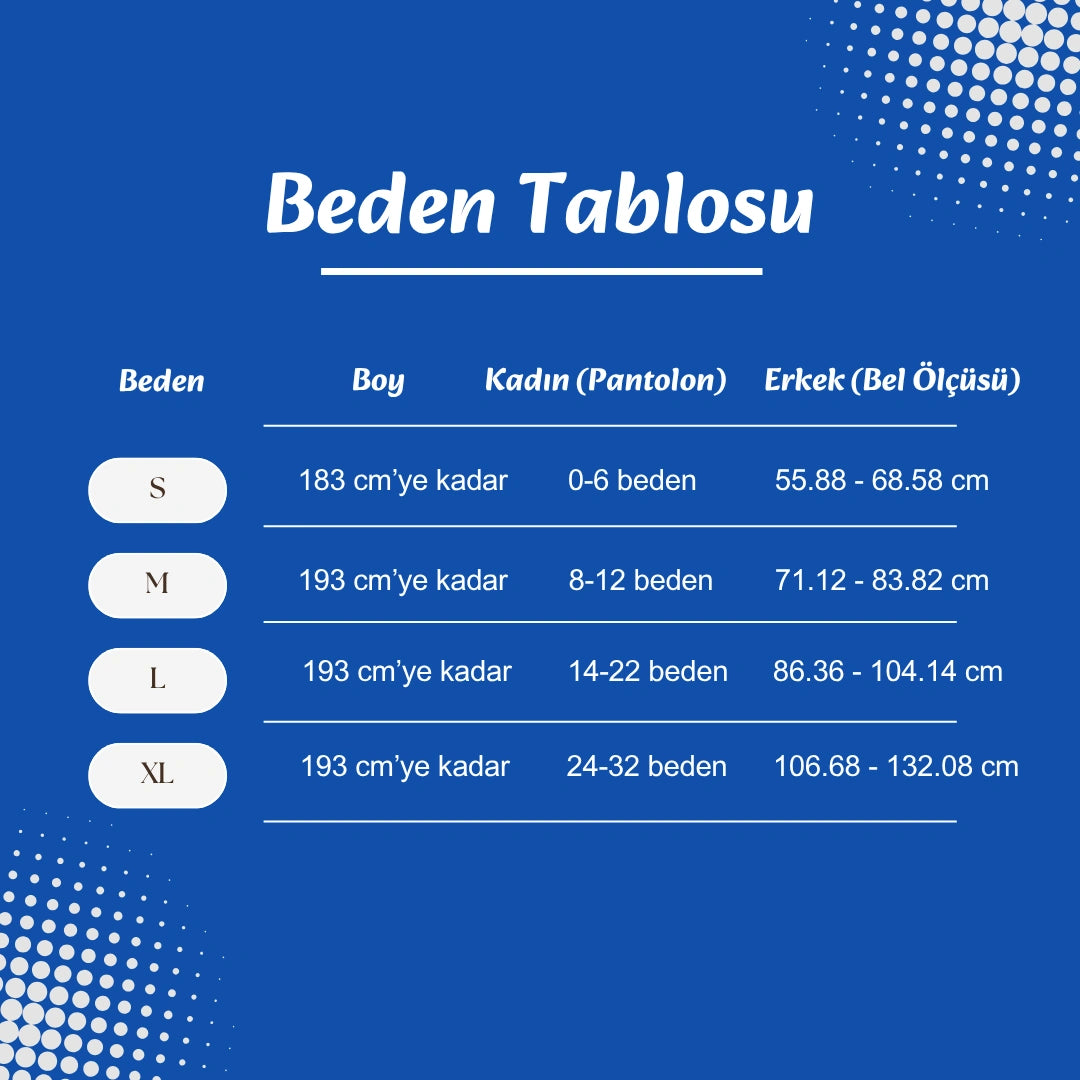 Kendi boy ve kilona uygun bedeni seçebilirsin. Ara bedende kaldıysan, daha sıkı sarılma hissi için bir beden küçük, daha gevşek kullanım istiyorsan bir beden büyük tercih edebilirsin. Kumaş esnek yapıya sahip olduğu için her vücut tipine kolayca uyum sağlar.